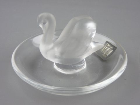 A LALIQUE SWAN PIN DISH with original paper label and engraved signature to the base, 6 cms high, 9 cms diameter