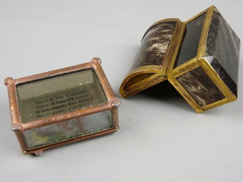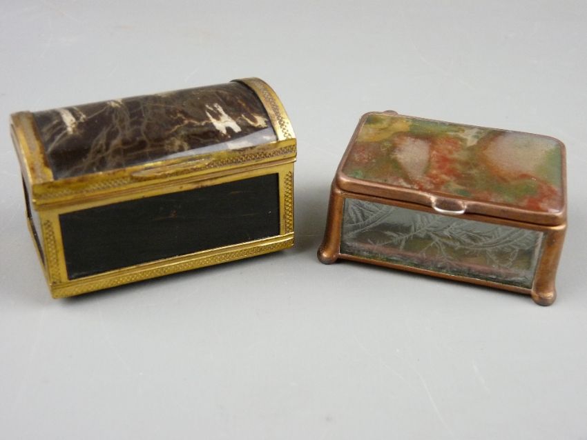 TWO VINTAGE AGATE BOXES, one in domed casket form, 5.5 and 6 cms long