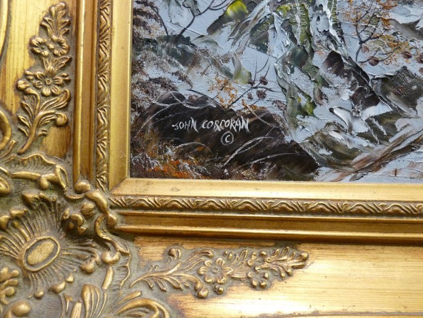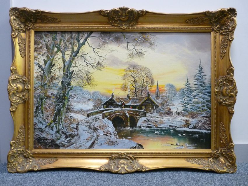 JOHN CORCORAN oil on canvas - snow covered bridge, cottage and church spire, signed, 50 x 75 cms