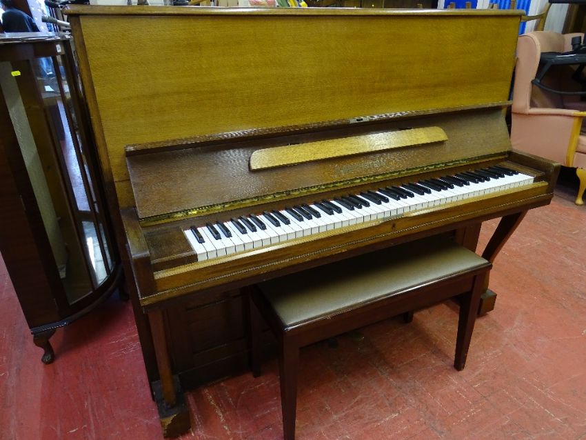 C BECHSTEIN OAK CASED UPRIGHT PIANO with a modern piano stool and contents, 123 cms high, 146 cms wide, 60 cms deep