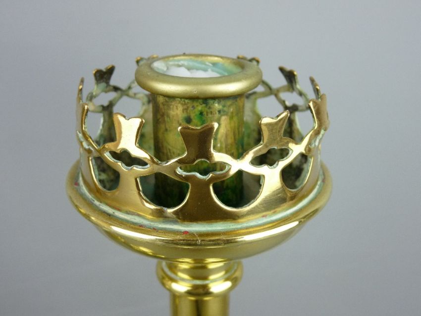 A PAIR OF GOTHIC STYLE BRASS CANDLESTICKS with pierced gallery drip pans, 31 cms high