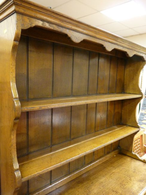 A QUALITY REPRODUCTION OAK DRESSER with blind carved detail to the doors, 185 cms high, 122 cms wide, 46 cms deep