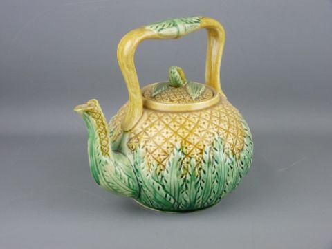 A PINEAPPLE FORM MAJOLICA TEA KETTLE WITH LID, 22 x 22 cms