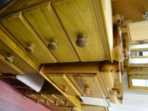 Reproduction pine bedroom suite of pedestal dressing table, stool, triple mirror and two bedside chests