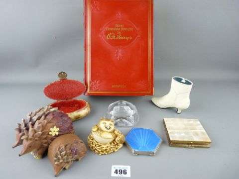 Bourneville chocolate tin and contents to include a silver and enamel compact and one other