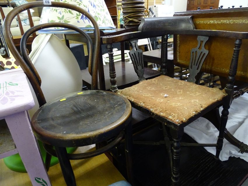 Corner chair with splatback and upholstered seat and a bentwood chair