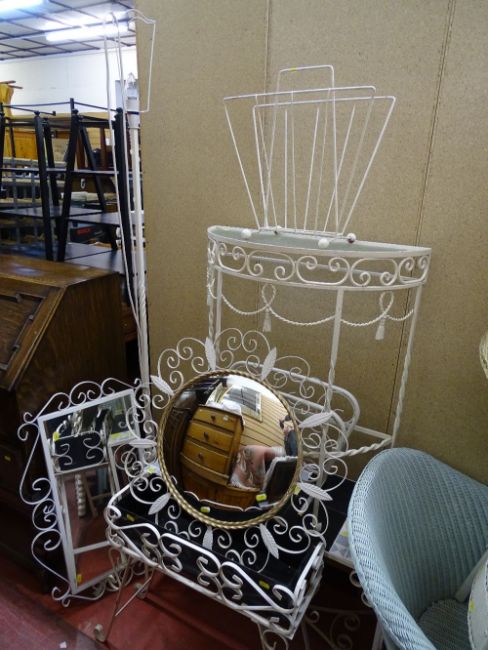 Quantity of white scrolled metal furniture including standard lamp, mirrors, occasional tables etc