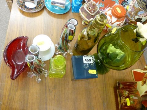 Quantity of decorative glassware include a hobnail uranium scent bottle and stopper