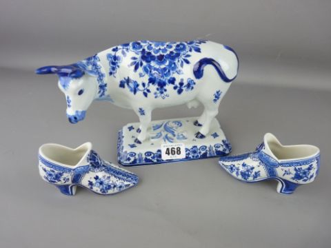 Oblong based blue and white Delft cow and pair of similar ornamental shoes