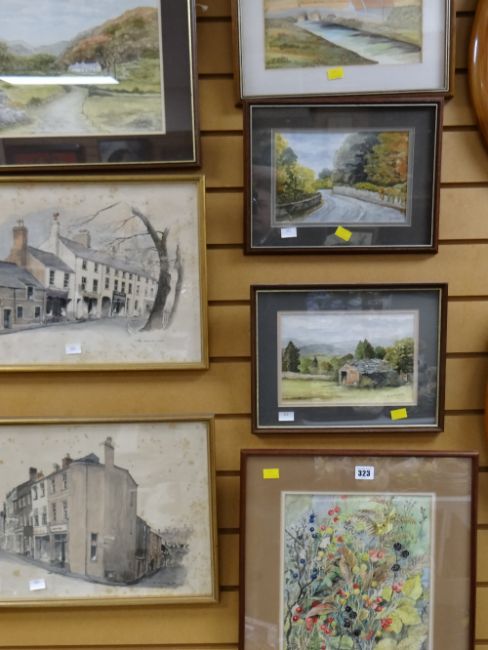 Three framed watercolours of Welsh rural scenes by E L SIMOCK together with a framed watercolour of various hedgerow fruits by A M SIMOCK & two framed prints of various locations in Pwllheli