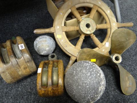 Collection of nautical items including small ship's wheel, brass propeller, metal floats & wooden sailing blocks & pullies