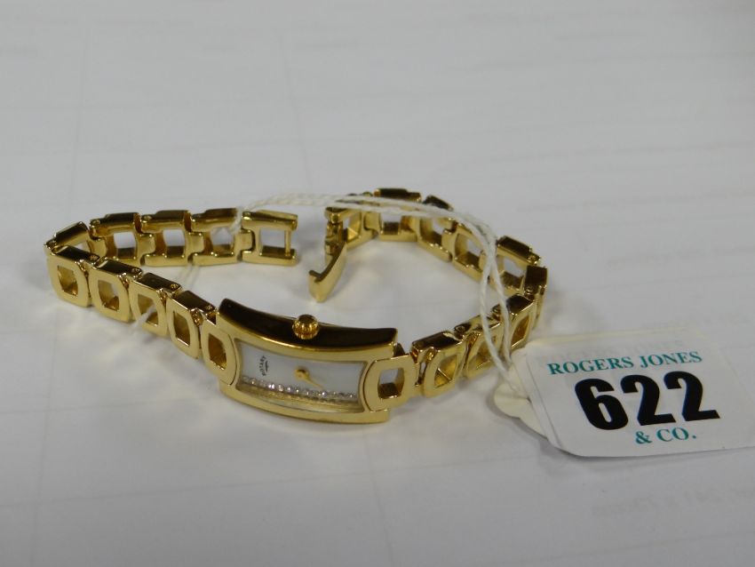 A modern yellow metal rotary ladies wristwatch with geometric linked bracelet & curved white dial with a surround of possible diamonds