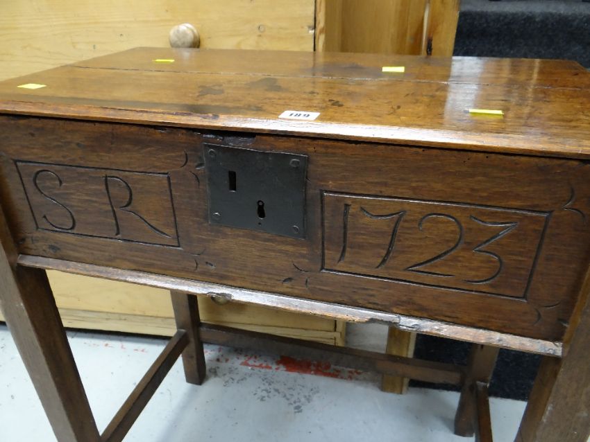 An antique oak carved raised Bible-box inscribed with initials 'S R' & 1723, height - 77cms, length - 69cms, depth - 41cms