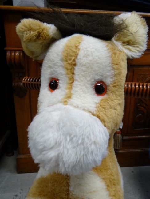 A collection of child's equipment including high chair, soft toy horse rocker & two chairs