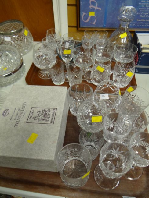 Two trays of various good quality drinking glasses & decanter