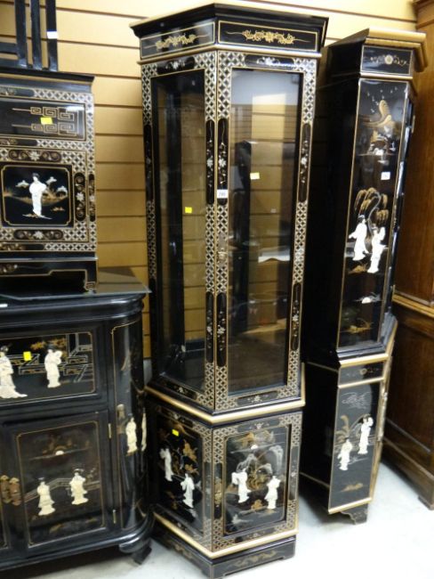 A modern lacquer gold painted & relief decorated illuminated octagonal glass shelved display cabinet with a cupboard base to match the last. Height 183cms