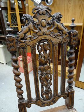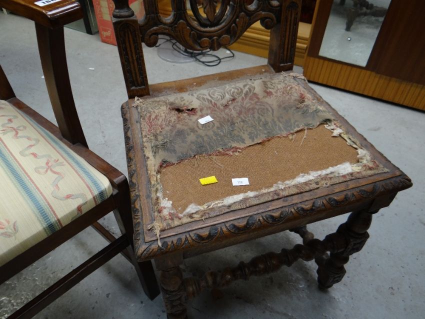 A stripped back elm seated Windsor-style armchair together with an ornately carved high backed hall chair (for reupholster) & a modern dining chair