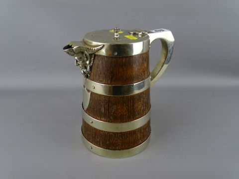 Victorian oak and EP banded lidded tankard with classical mask spout