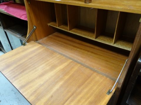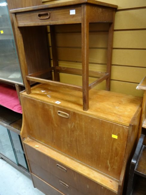A vintage teak drop-down bureau with three drawers together with a matching side / lamp table
