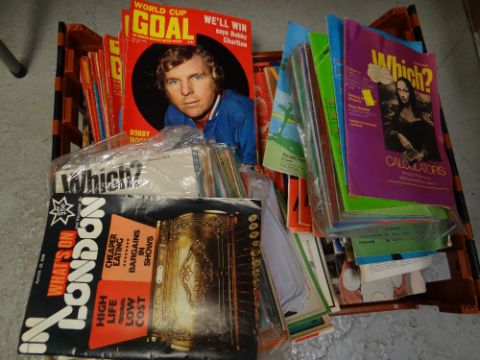 Crate of various vintage periodicals including Private Eye from the 1970s, World of Goal, Football Monthly etc