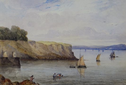 ATTR. THOMAS LINDSAY (1793-1861) watercolour - coastal scene with sail-boats and figures, unsigned, 16 x 24cms