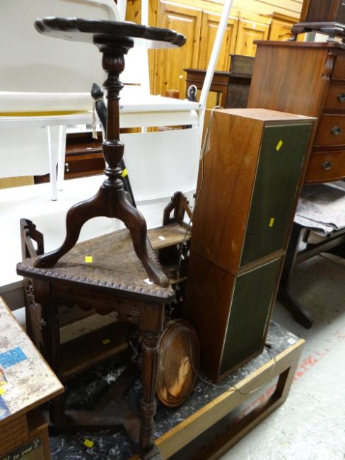A small triangular carved top side table, wine table, copper bed pan, vintage speakers, small wall rack