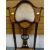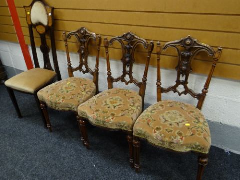 Three ornately carved walnut dining chairs together with a mahogany Art Nouveau-style high backed inlaid decorated bedroom chair