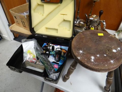 Small parcel of fishing equipment including two reels & a small stool etc