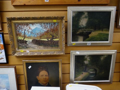 Five framed pictures - country scenes together with a head & shoulders of a Victorian lady