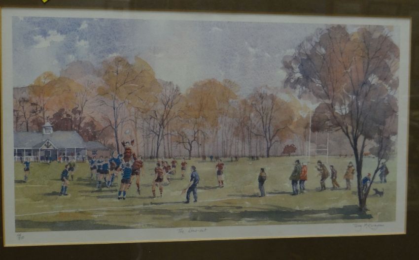 Beaten copper framed mirror with crabs in relief together with a limited edition rugby print entitled 'The Line Out'