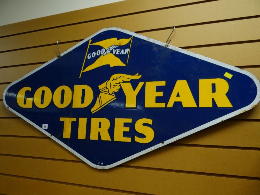 A vintage enamel metal 'Goodyear Tires' advertising sign, 123 x 66cms