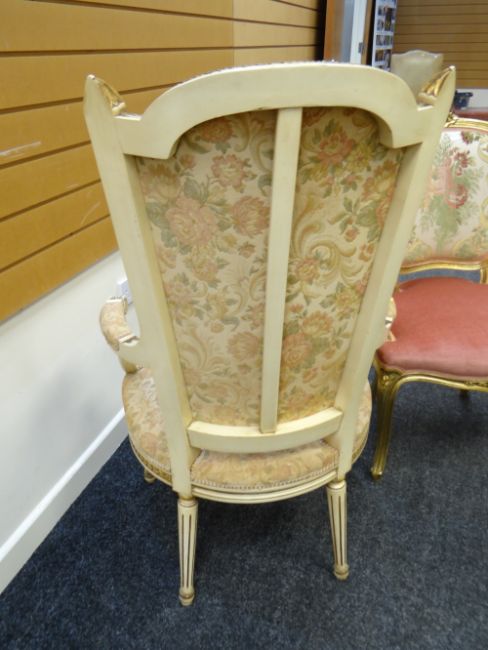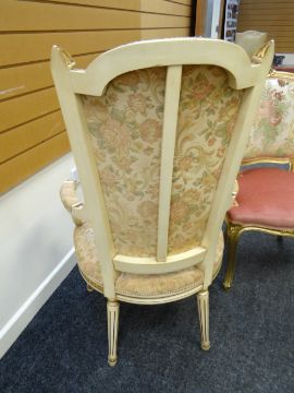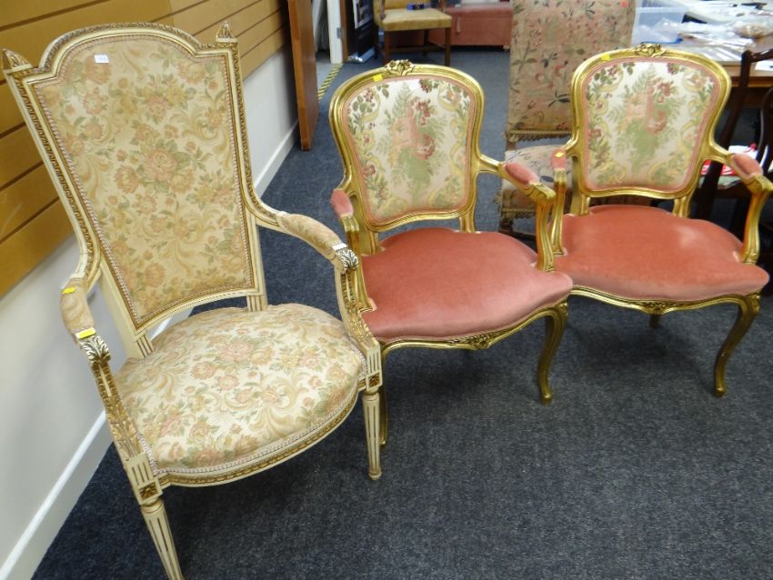 A pair of reproduction French-style gilt armchairs together with another French-style high back bedroom chair