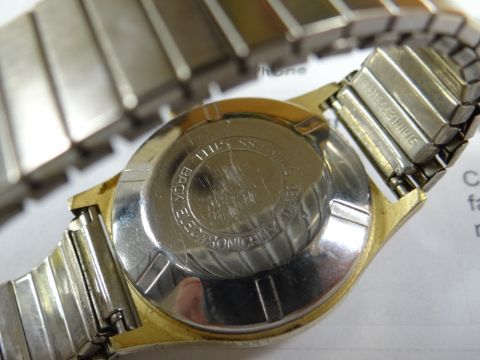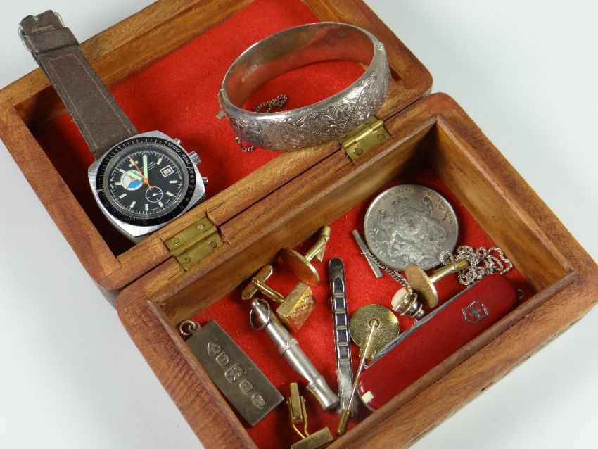 Wooden box containing a silver ingot ounce pendant, silver bangle, wristwatch etc