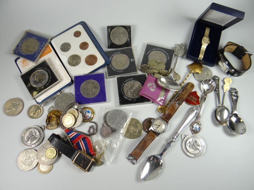 Tin containing quantity of Royal Commemorative crowns, pre decimal coinage, wristwatches etc