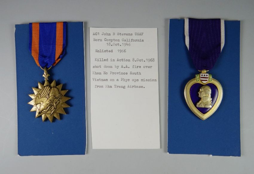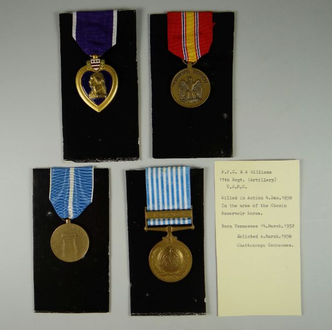 AN ALBUM OF UNITED STATES MILITARY & OTHER MEDALS to include medal group awarded to PFCEA Williams, 11th Regiment Artillery US Marine Core, another group awarded to L/Corporal W A Ketchum of the US Marine Core & a medal group awarded to AC1 John B Stephens USAF, all three killed in action & to include the Purple Heart. The album also includes various early twentieth century campaign medals to include The Philippine Campaign, Second Haitian Campaign, The Campaign in Mexico, The Dominican Campaign, The Spanish Campaign etc, many with printed information cards & some coins from the different countries. (26 medals only in total & 7 coins)condition:the purple hearts and air medals are named