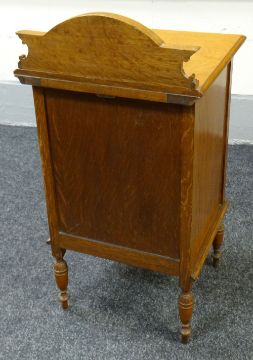 AN EDWARDIAN CARVED OAK PURDONIUM lined fall front, 82cms high