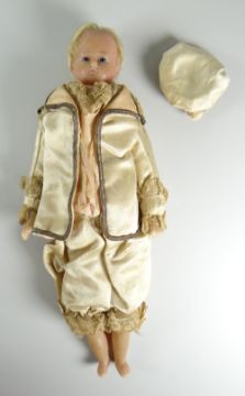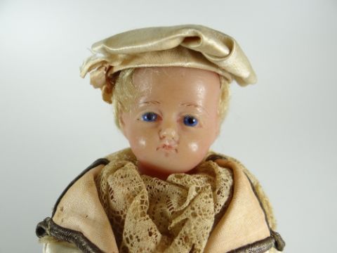 A VICTORIAN POURED WAX SAILOR BOY DOLL with blue glass eyes and blonde wig, shoulder plate and wax limbs, stuffed body wearing silk and lace uniform, circa 1870, 26cms high