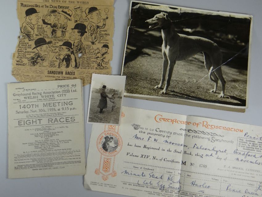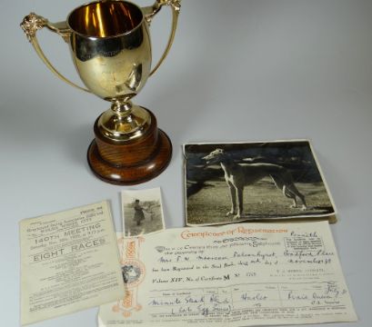 Provenance: By family descent (further details available for prospective purchasers making serious enquiries about acquiring the cup). The cup is accompanied by a photograph of 'Beef Cutlet' and 'Pa'. A photograph of greyhound Clover Hill Fairy, a newspaper cutting from News of the World and an Irish Coursing Club Certificate of Registration for Minute Steak and a 1935 programme for a meeting at Welsh White City