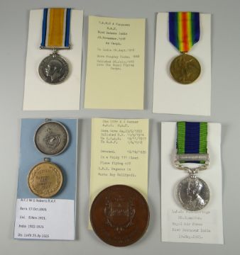 GROUP OF ASSORTED MEDALS & MEDALLIONS to include British War medal & Victory medal, engraved to AMGA Ferguson RAF together with two sporting medallions, Royal Air Force India Championship & Football runners up, bronze medallion The Foundation of John Harrison & India General Service medal W G Eldridge with clasp Waziristan 1925 (with printed information cards) (6)