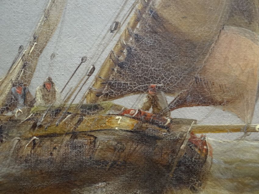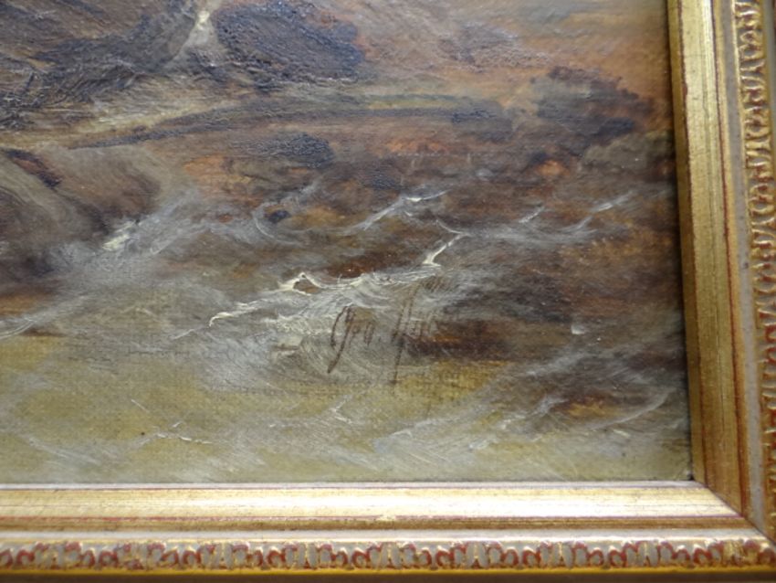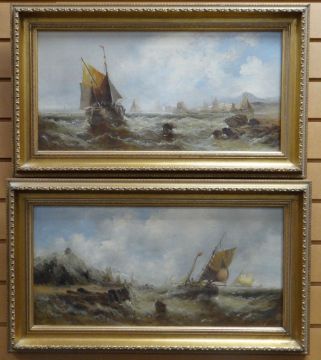 BRITISH MARITIME SCHOOL a pair, oils on canvas - maritime scenes with sailing boats in squally seas, indistinctly signed, 30 x 59cms