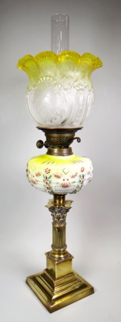 A GOOD ANTIQUE OIL LAMP composed of stepped and Corinthian column brass base, painted vaseline glass reservoir and yellow tint etched shade, nautical logo to wick-winder, 67cms high