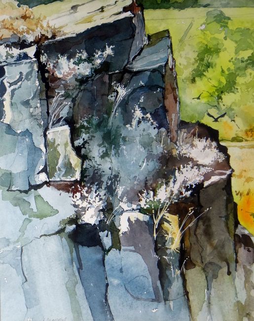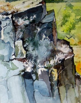DAVID MORRIS watercolour - granite ridge with vegetation, probably Derbyshire, signed, 26 x 21cms