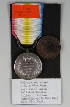 CANDAHAR GHUZNEE CABUL 1842 MEDAL engraved Private William Jones HMs 41st Regiment together with a Half Anna East India Company coin