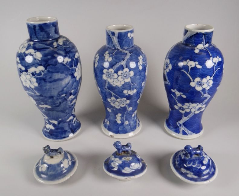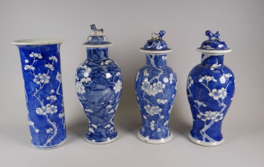THREE LIDDED CHINESE POTTERY PRUNUS DECORATED BALUSTER VASES & SIMILAR CHIMNEY VASE, the chimney vase with flared neck 21cms high, each with character marks to basecondition:one lid has been badly damaged and restored