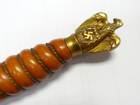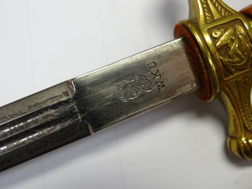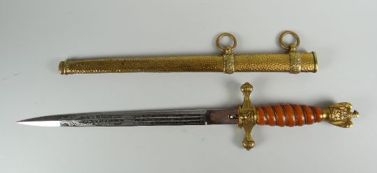 A GERMAN KRIEGSMARINE DAGGER with beaten effect yellow metal scabbard, yellow metal finial and cross-guard with centred anchor emblem, blade decorated and marked WKC, 37.5cms long, scabbard 28.5cms long