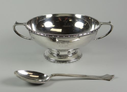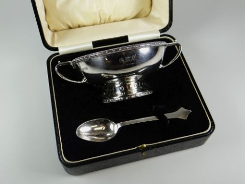 A CASED SILVER PORRINGER & SPOON SET body of porringer engraved, Birmingham 1929 by Barker Bros Ltd, 7.7ozs