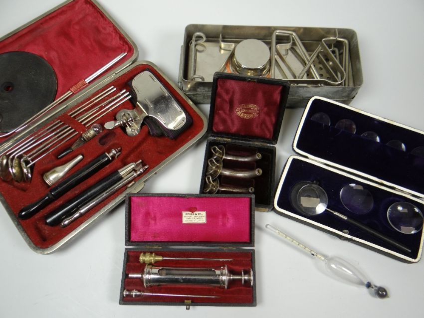 A PARCEL OF VINTAGE EAR, NOSE & THROAT MEDICAL INSTRUMENTS including a cased set of three tracheotomy tubes by Allen & Hanburys Ltd