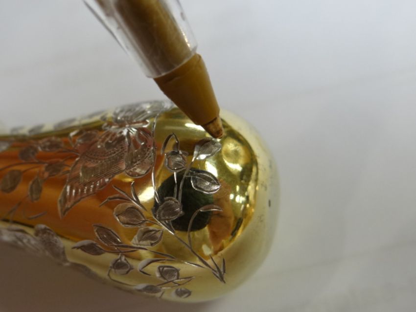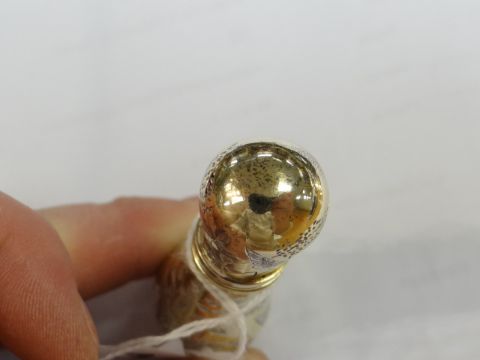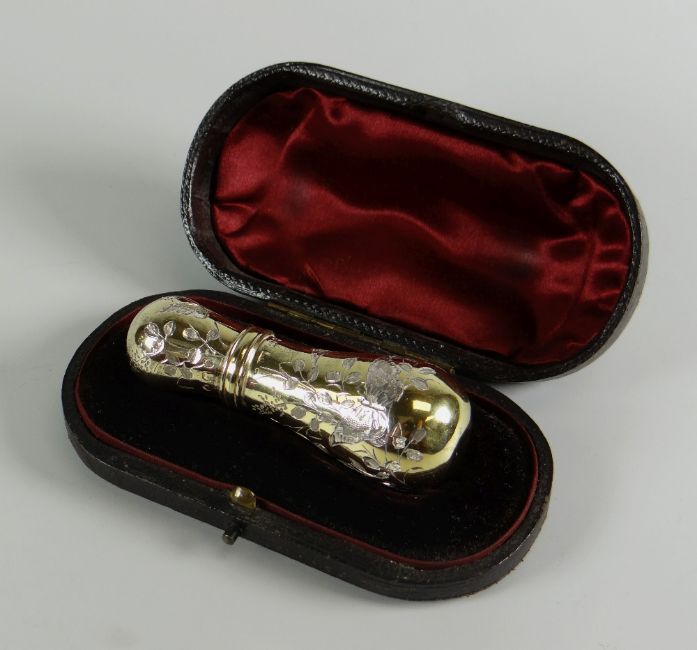 A CASED VICTORIAN SILVER-GILT SCENT BOTTLE with screw-top and engraving decorated with butterflies and wild-flowers, London 1889, Sampson & Mordancondition:There is very light surface wear to the top and there is one very small ding on the bottom otherwise all good, the cork liner in the lid looks good, there are no other issuesIt is 7cm in length and no it would not have had a stopper, it has a screw-type lid