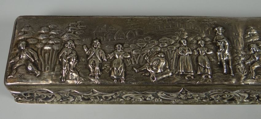 A GOOD CHESTER SILVER FAN-BOX the hinging lid having an extensive village scene with numerous figures, silver-gilt interior, Chester 1906, maker's marks for George Nathan & Ridley Hayes, 6.7ozs