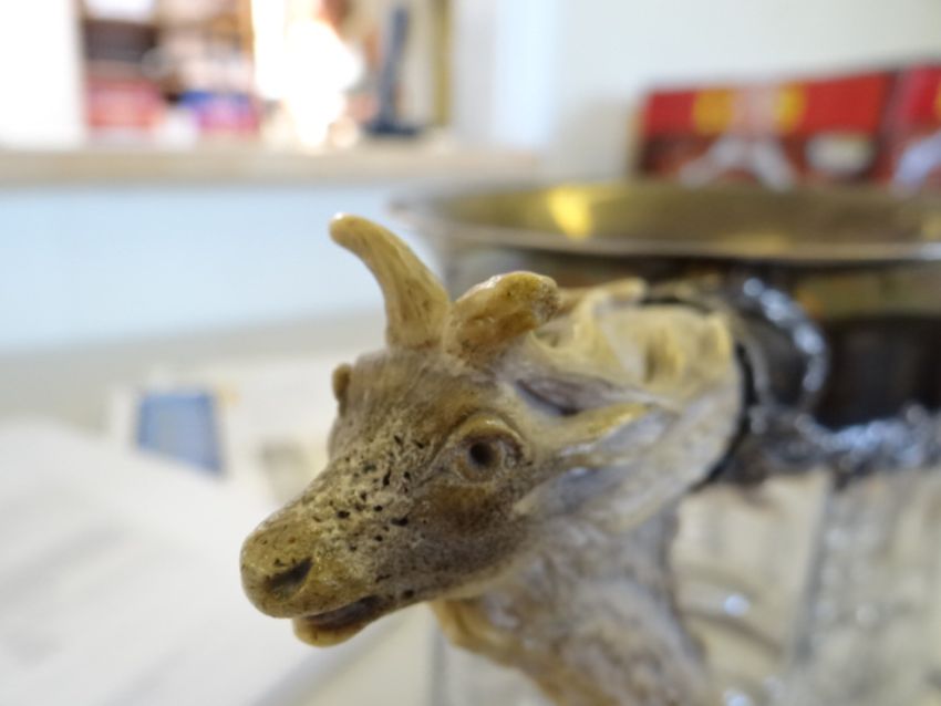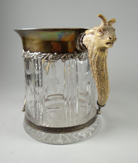 A RARE SILVER, ANTLER & GLASS TOASTING VESSEL believed American, late nineteenth / early twentieth century (silver marked STERLING PAT) the twin antler handles finely carved into deer heads, the glass with dimple and vertical decoration all round, 16cms highcondition:There is slight wear on one horn otherwise everything else is good